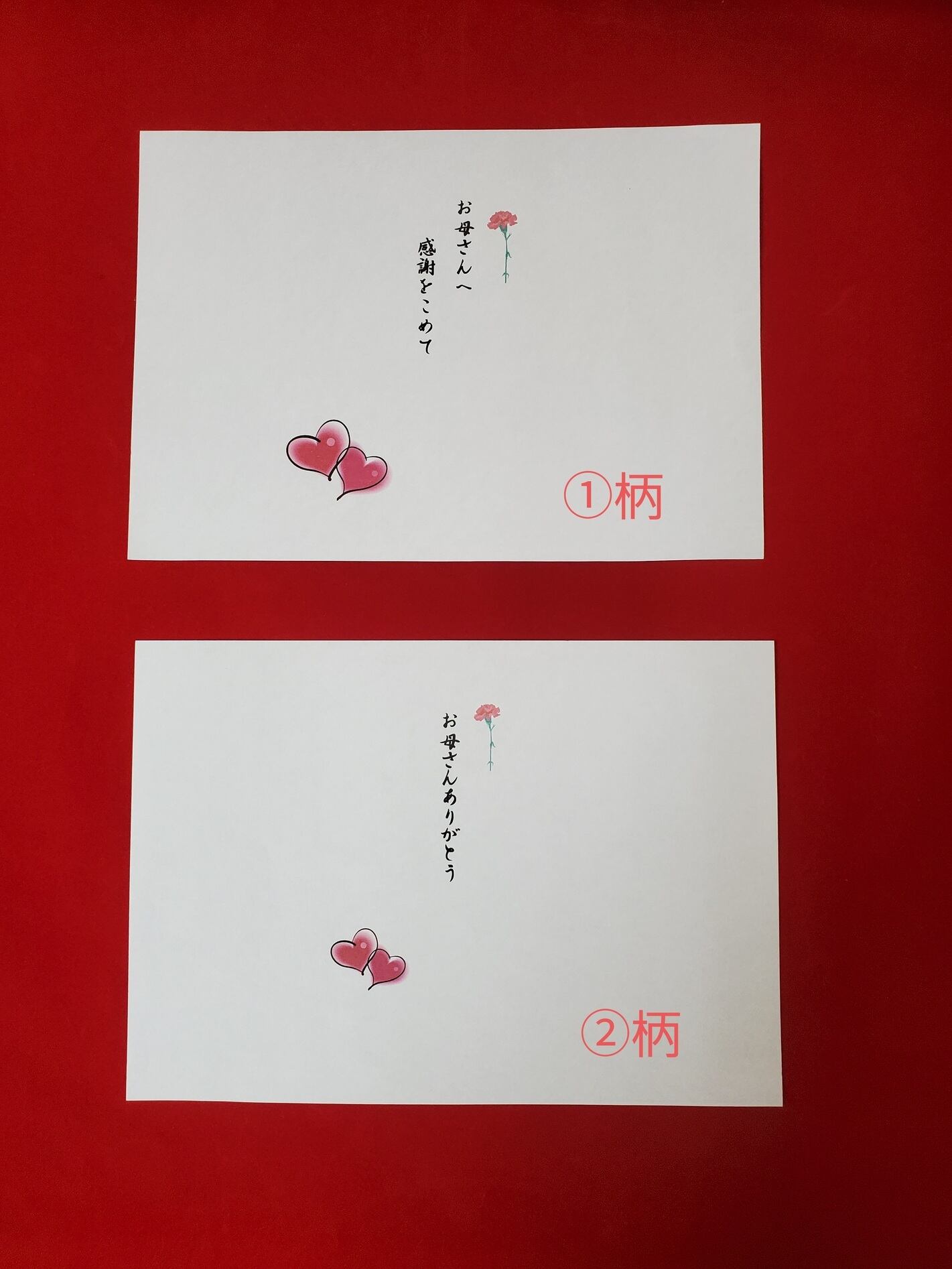 母の日掛け紙のご用命は、ご注文時にご注文メモ欄もしくは、備考欄にご希望番号(①柄か②柄)をご記入くださいませ。